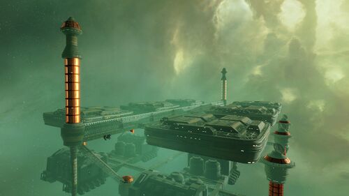 The installation consists of a series of bunkers, arranged symmetrically and connected by support struts. Several vertical pylons rise from the corners, each displaying red Krusual tribal markings. The structure floats within a pale green cloud, often contrasted by orange-red nebulae in the background.