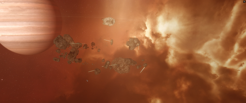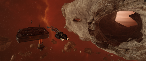 The drug compound is hidden within the shadows of a large hollow asteroid, embedded in a circular asteroid belt above Tvink VII, a ringed gas giant. Thukker mining barges provide cover for the illegal drug production, while occasional Angel Cartel patrols can be observed along the outer perimeter of the site.
