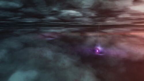 At the heart of one depression lies a crystalline formation, radiating an intense violet glow. Streams of energy vent from its upper axis, creating a faint auroral plume that pierces the surrounding murk. Spectral readings indicate the emissions are partially coherent, possibly responsible for the cloud’s ionized composition.