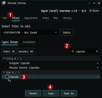 * Remove capsules (aka pods) from your [[Public:Signal_Cartel_Overview_Pack|Overview Settings]]. Destroying another player's pod is an almost sure-fire way to get kicked from Signal Cartel! By removing pods from your overview, you won't be able to inadvertently target them. Note that this does reduce your intel a bit, so the choice is yours. | |||